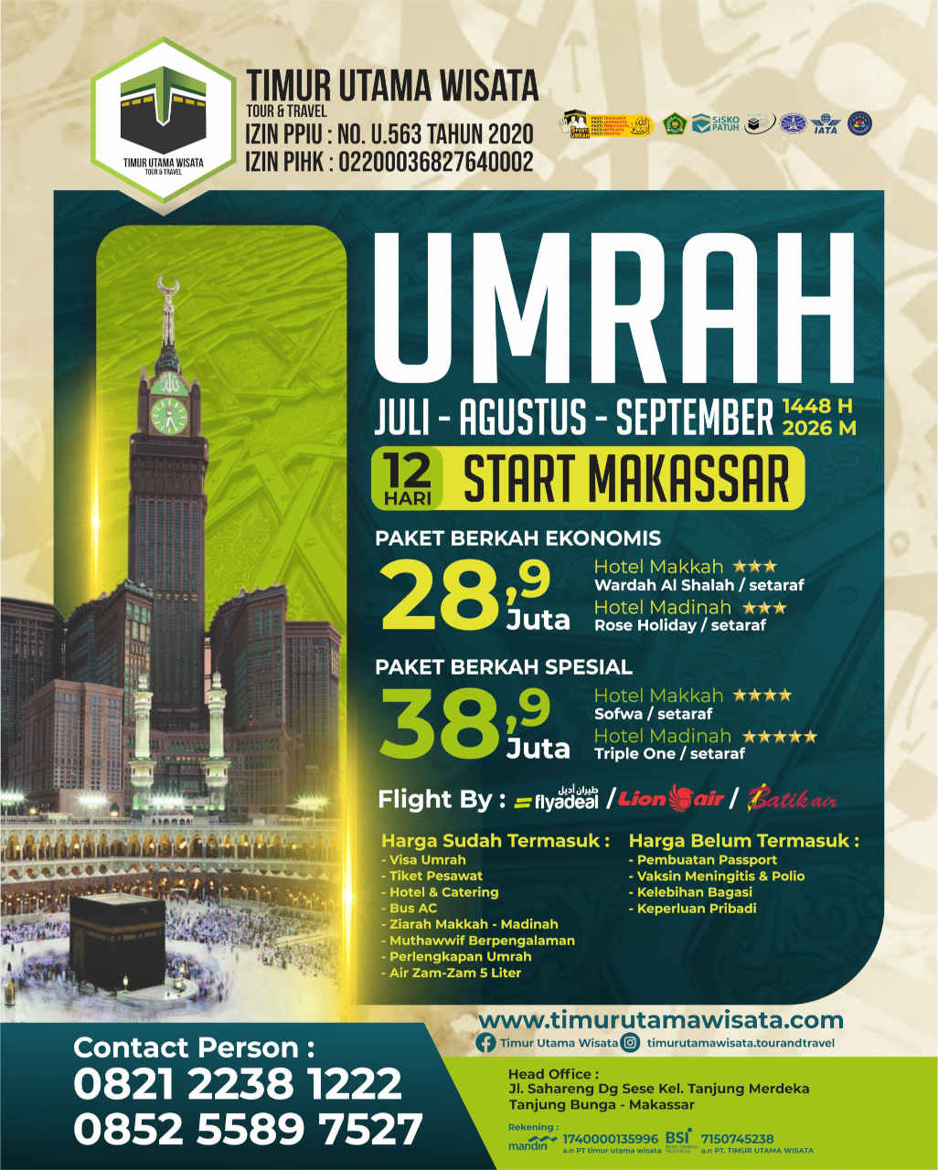 PT. Timur Utama Wisata Tour & Travel sebagai Biro Resmi Perjalanan & Penyelenggara Ibadah Umrah di Indonesia, hadir untuk menjembatani ummat Islam melaksanakan perjalanan ibadah ke Baitullah ( Saudi Arabiah ) serta kota dan tempat bersejarah islam lainnya di dunia